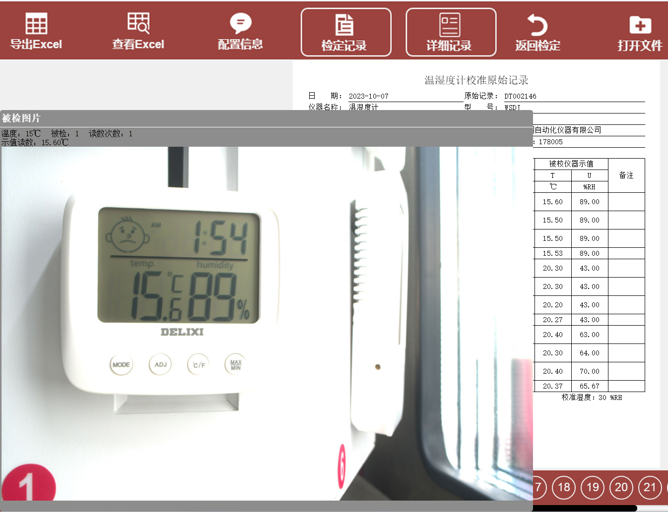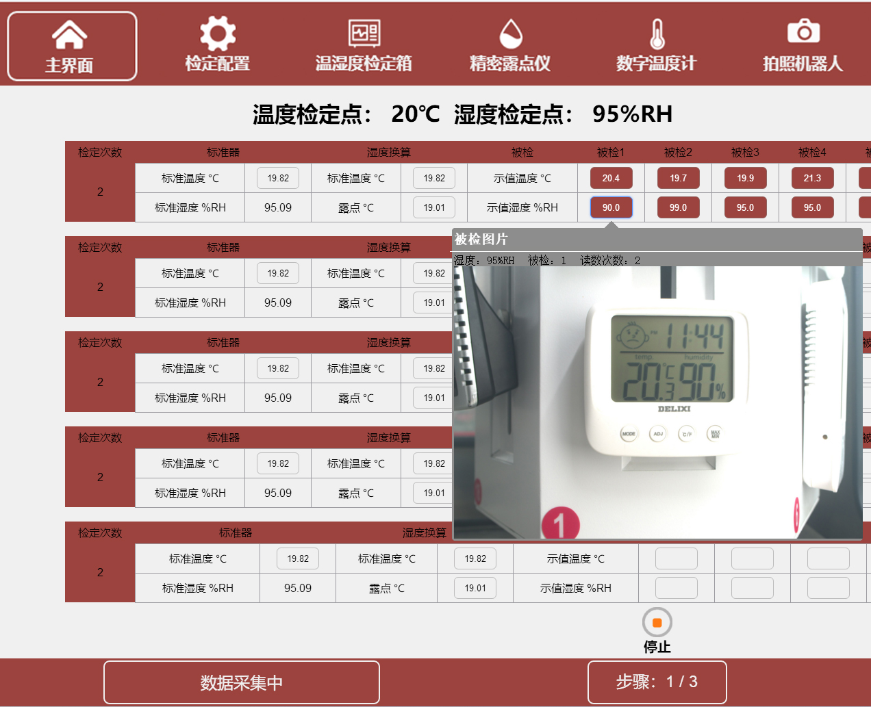 The system automatically controls the temperature and humidity of the calibration chamber, monitors the temperature and humidity values of the calibration chamber in real time through a dew point meter, and automatically makes stability judgments. After the stability conditions are met, the system automatically controls the camera robot and camera to locate each thermometer under inspection in order to take photos and archive them. When all calibration points are completed and the data processing page is entered, the user only needs to spend a few minutes to enter the inspected data based on the inspected pictures, and the system will automatically calculate the verification results and give the calibration conclusion.